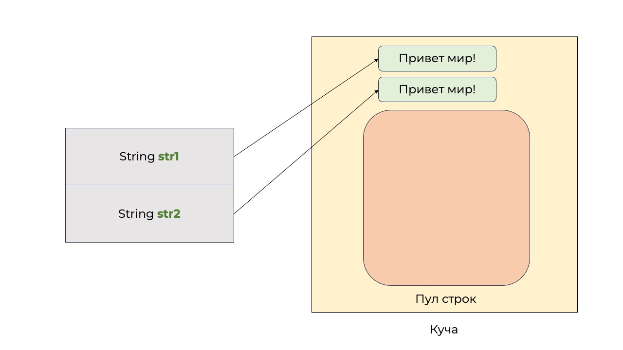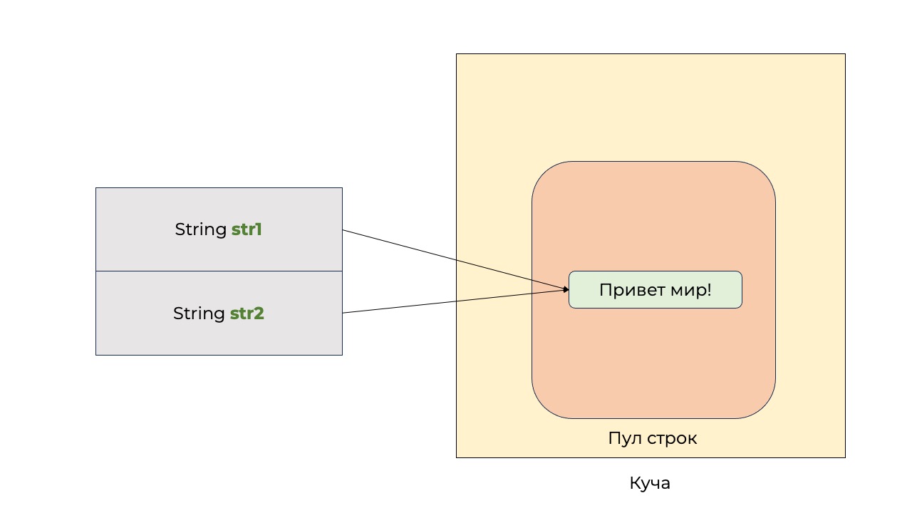 В этом примере будет создан только один объект. Сначала JVM создаст новый объект со значением Привет мир!, а затем найдет строку с таким же значением в пуле и вернет ссылку на тот же экземпляр вместо создания нового.