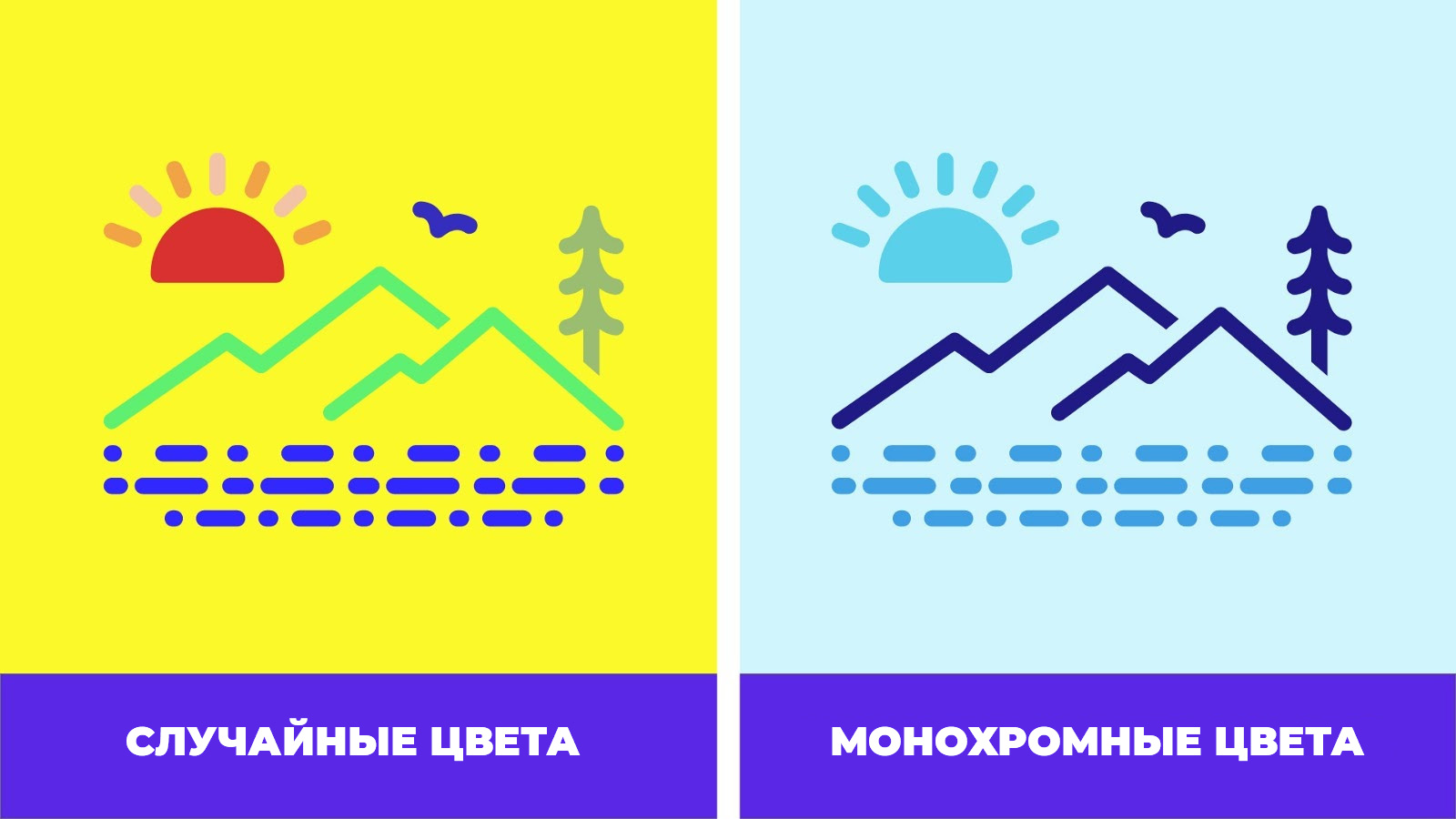 Если вы не верите, что цвет влияет на ваш дизайн, взгляните на этот пример. Это точно такая же иллюстрация, разница лишь в цветах. На какую из них приятно смотреть, а от какой хочется взорваться?