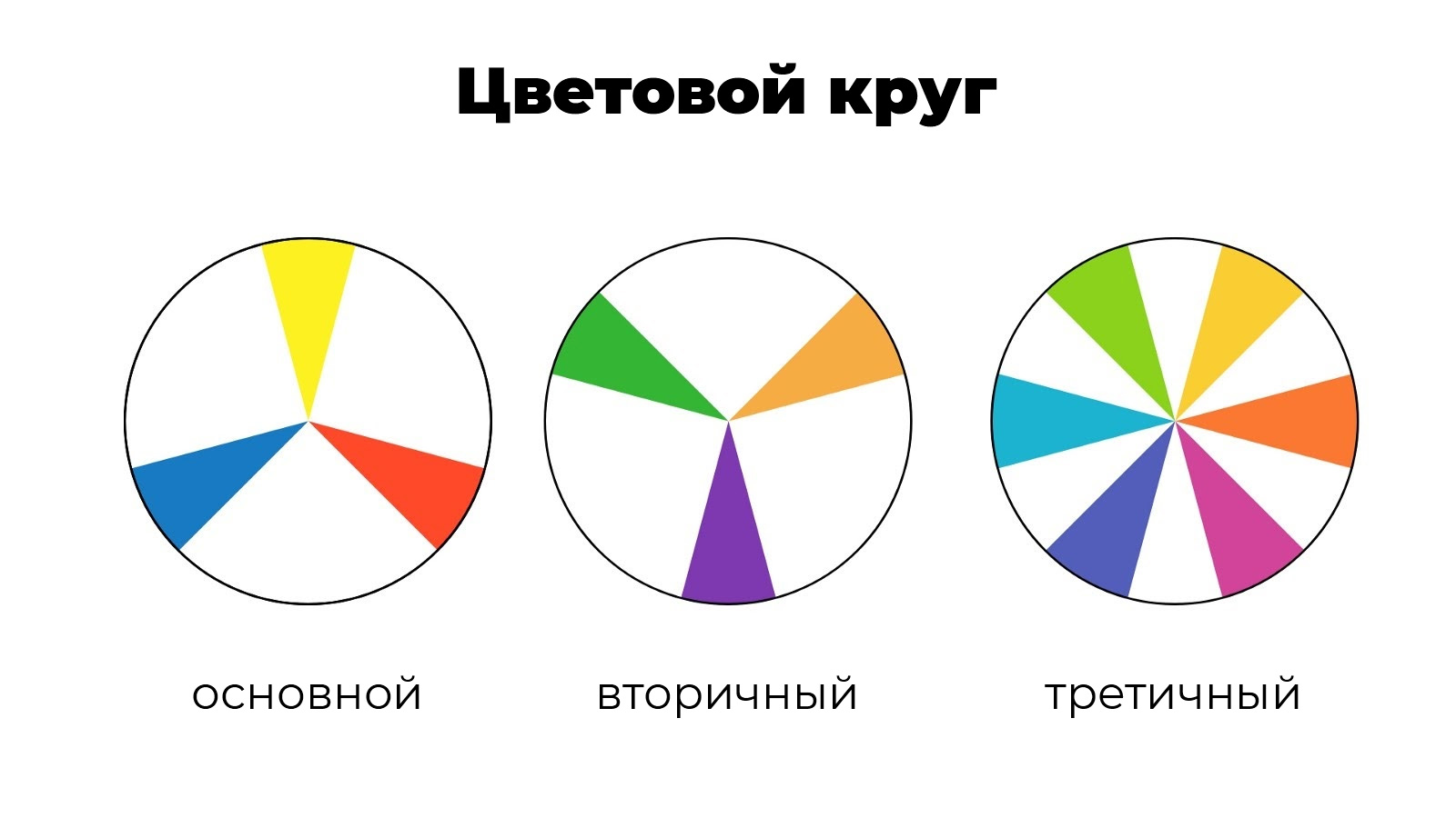 Существует множество версий цветового круга, но в этой статье мы рассмотрим базовую версию. Цветовой круг делится на 3 основные категории: основной, вторичный и третичный цвет.