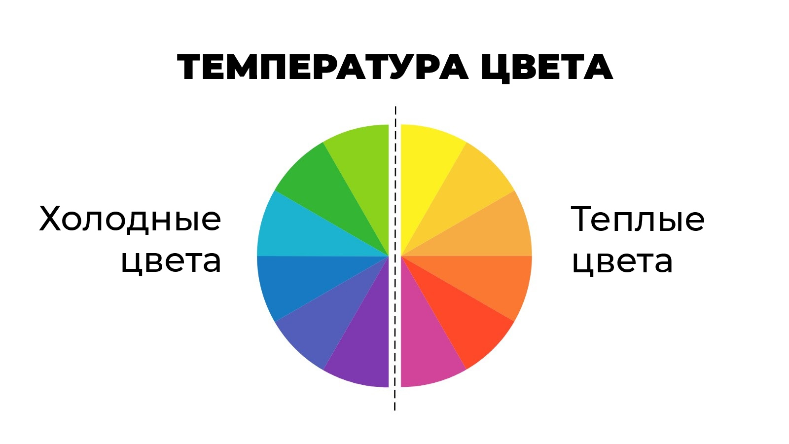 Цветовой круг делится пополам на теплые и холодные цвета. Теплота или холодность цвета называется цветовой температурой. Подумайте о том, как вы можете использовать теплые и холодные цвета в своих проектах веб-дизайна для достижения определенного настроения.