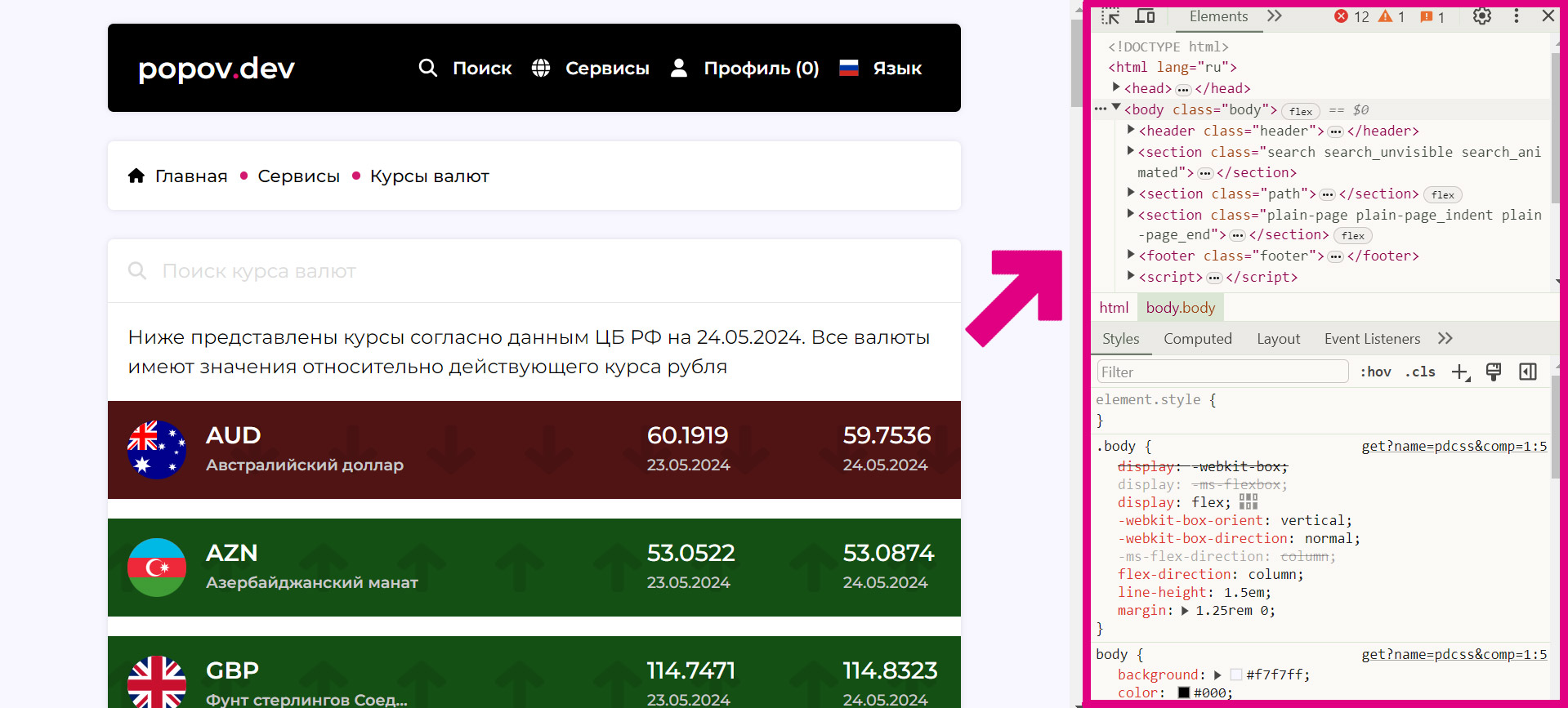 На любой странице можно открыть клавишей F12 или сочетанием Ctrl + Shift + I, а так же в меню браузера (три точки), -> Дополнительные инструменты -> Инструменты разработчика.