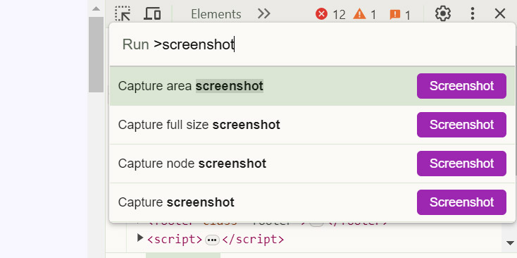 При открытой панели инструментов разработчика, нажимаем сочетание Ctrl + Shift + P. Это вызывает командный режим и вводим в поиске команду Screenshot.